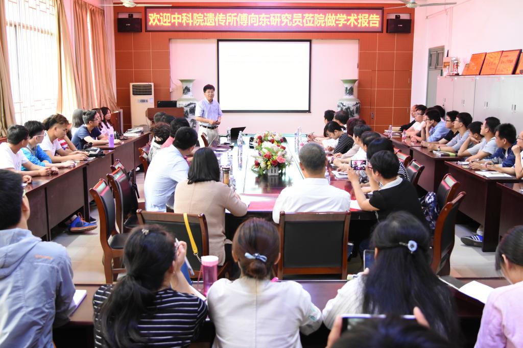 傅向东研究员以“Genetic Control of Nitrogen Use Efficiency and Grain Yield in Rice”为题,讲述了水稻增产关键基因DEP1在水稻的氮肥高效利用方面发挥着重要调控作用,解析赤霉素信号途径及其协同调控植物生长和代谢的分子机制,揭示水稻穗发育和高产性状形成的分子基础。报告结束后,傅向东研究员还与老师和同学们就如何提高农作物氮肥的利用效率等方面进行了深入地交流和探讨,为太阳城平台(中国)官方网站 教师今后开展同类研究提供参考依据。