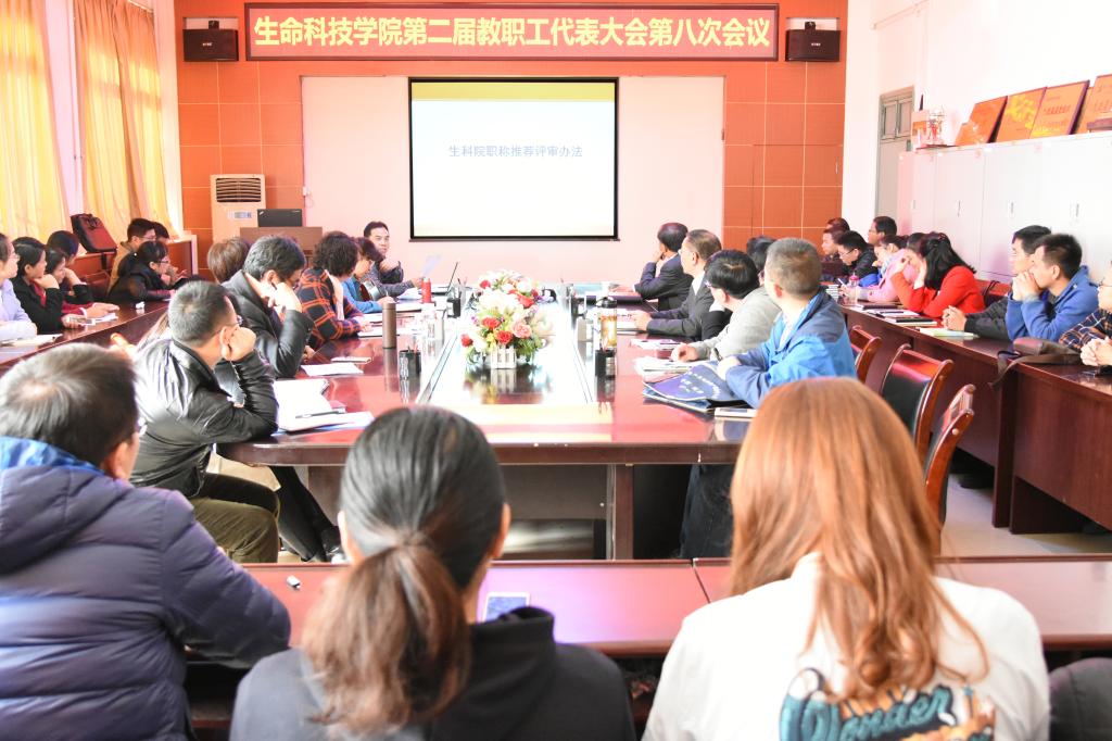 为更好地发挥职称评审的导向作用,进一步提高教学、科研质量水平,推进学院的学科建设和发展,根据河南省人力资源社会保障厅《河南省高等学校教师(实验人员)中高级专业技术职务任职资格申报评审条件(试行)》(豫人社办【2017】12号)和河南科技学院《教师专业技术职务任职资格推荐评审办法(试行)》(校发字【2017】121号)文件精神,结合实际,太阳城平台(中国)官方网站 制定了《生命科技学院教师系列专业技术职务任职资格推荐、评审量化积分办法(含实验系列)(试行)》。根据《工会法》、《高等学校教职工代表大会暂行条例》和我校《二级教职工代表大会实施办法》的有关规定,2017年11月2日上午,太阳城平台(中国)官方网站 第二届教职工代表大会第八次会议在E110室召开,院党政班子成员及教职工代表80余人参加会议。