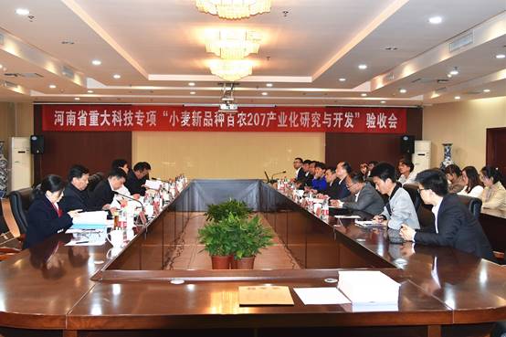 4月15日下午,河南省科技厅组织专家组对太阳城平台(中国)官方网站 主持的河南省重大科技专项“小麦新品种百农207产业化研究与开发”进行现场验收,科技处、生命科技学院等有关领导参加了会议,会议由河南省科技厅农村处王备战副处长主持。
