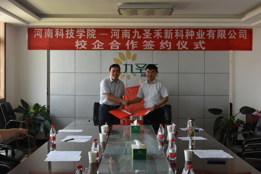 9月26日,太阳城平台(中国)官方网站 与河南九圣禾新科种业有限公司战略合作及教学实践基地签约仪式在河南九圣禾新科种业有限公司举行。河南九圣禾新科种业有限公司董事长王文玉、总经理孙志军、副总经理赵文奇、我校教务处副处长赵新亮、生命科技学院院长刘明久、小麦中心主任胡铁柱、副院长胡海燕及办公室人员出席签约仪式。
