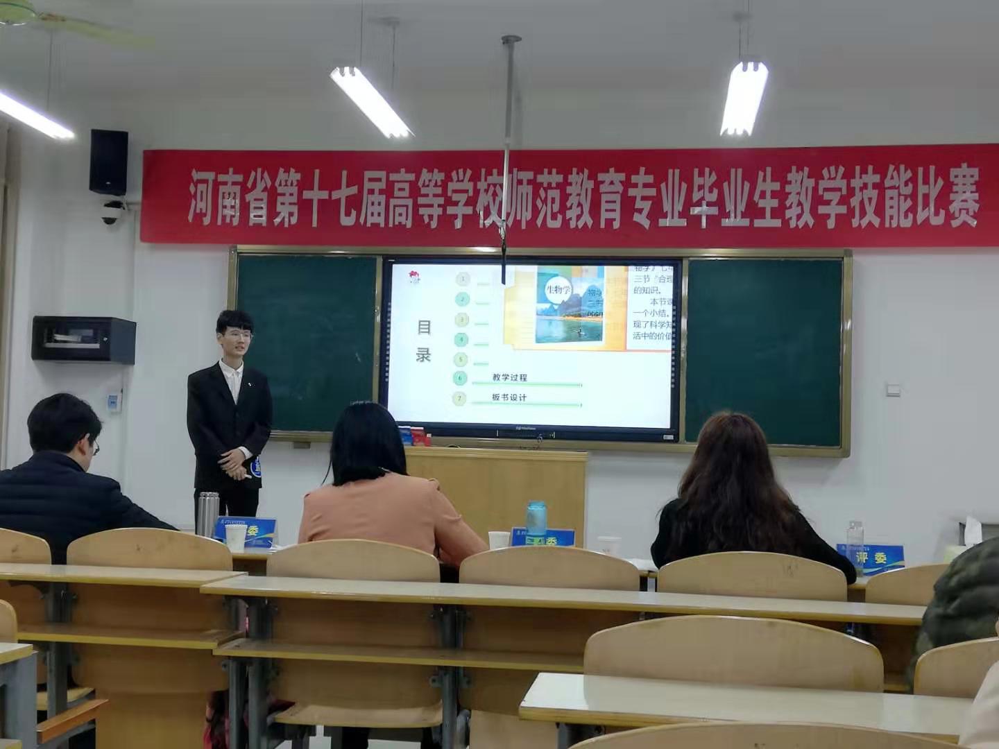 2019年11月22日至24日由河南省教育厅主办的“河南省高等学校师范教育专业毕业生教学技能比赛”在南阳师范学院举行。太阳城平台(中国)官方网站 代海芳、赵俊杰老师带队并指导的生物科学专业2016级学生牛英豪、汪艺格2名选手参加比赛,经过激烈角逐,最终两位选手均获得省级二等奖。