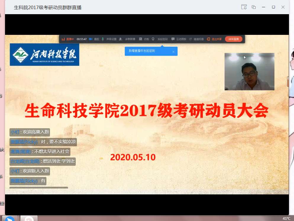 为进一步调动学生的考研积极性,让同学们更好的挖掘自身潜能,把握深造机会,2020年5月10日晚,学院辅导员杨运华老师通过钉钉在线直播的形式召开2017级考研动员大会,学院2017级学生干部140余人参加了动员会。