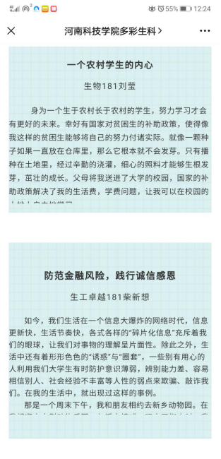 6月24日,学校资助中心微信公众号推出河南科技学院学生资助诚信教育线上答题微信,太阳城平台(中国)官方网站 第一时间组织各年级作答,在学生中宣扬诚信意识和感恩精神,进行诚信教育网络宣传,并将同学们所得的分数进行统计,了解学生资助金融知识理解水平,最终太阳城平台(中国)官方网站 农学182班王彩在本次“资助诚信教育线上知识竞赛”活动中入围全校前十名。本次活动在学生中普及了金融、贷款、征信知识,进一步提高大学生的诚信意识。