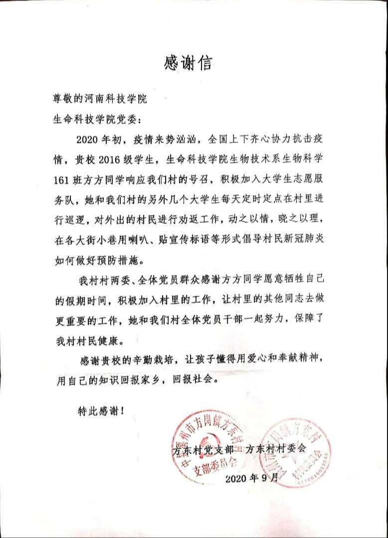 2020年初,疫情来势汹汹,全国上下齐心协力抗击疫情,贵校2016级学生,生命科技学院生物技术系生物科学161班方方同学响应我们村的号召,积极加入大学生志愿服务队,她和我们村的另外几个大学生每天定时定点在村里进行巡逻,对外出的村民进行劝返工作,动之以情,晓之以理,在各大街小巷用喇叭、贴宣传标语等形式倡导村民新冠肺炎如何做好预防措施。 我村村“两委”、全体党员群众感谢方方同学愿意牺牲自已的假期时间,积极加入村里的工作,让村里的其他同志去做更重要的工作,她和我们村全体党员干部一起努力,保障了我村村民健康。 感谢贵校的辛勤栽培,让孩子懂得用爱心和奉献精神,用自己的知识回报家乡,回报社会。
