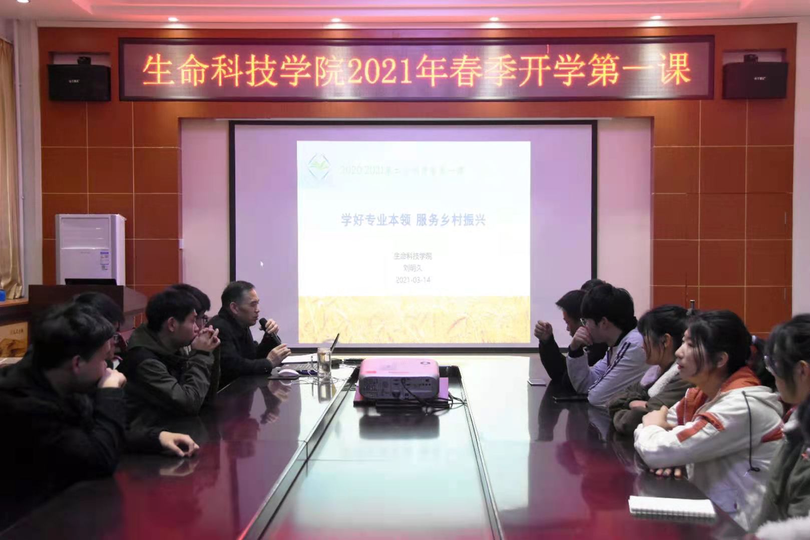 为扎实做好大学生思想政治教育、专业素养教育,进一步强化使命担当、厚植家国情怀,3月14日晚,生命科技学院院长刘明久在实验楼E段110会议室为学院2020级学生讲授春季学期开学第一课。