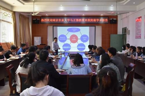 5月17日,南京农业大学马正强教授一行4人来我校开展学术交流。在相关人员陪同下,马教授一行来到我校位于新乡市郎公庙镇的小麦千亩基地,考察了合作开展的小麦抗赤霉遗传改良材料的生长情况。随后在生命科技学院会议室E110做了题为《小麦抗赤霉病基因的发掘和育种应用》的学术报告。学术报告由生命科技学院院长刘明久主持,生命科技学院部分教师和研究生60多人参加了报告会。