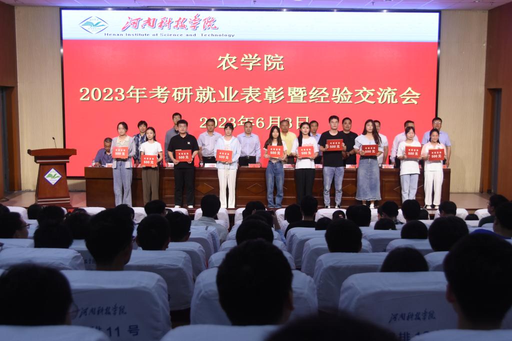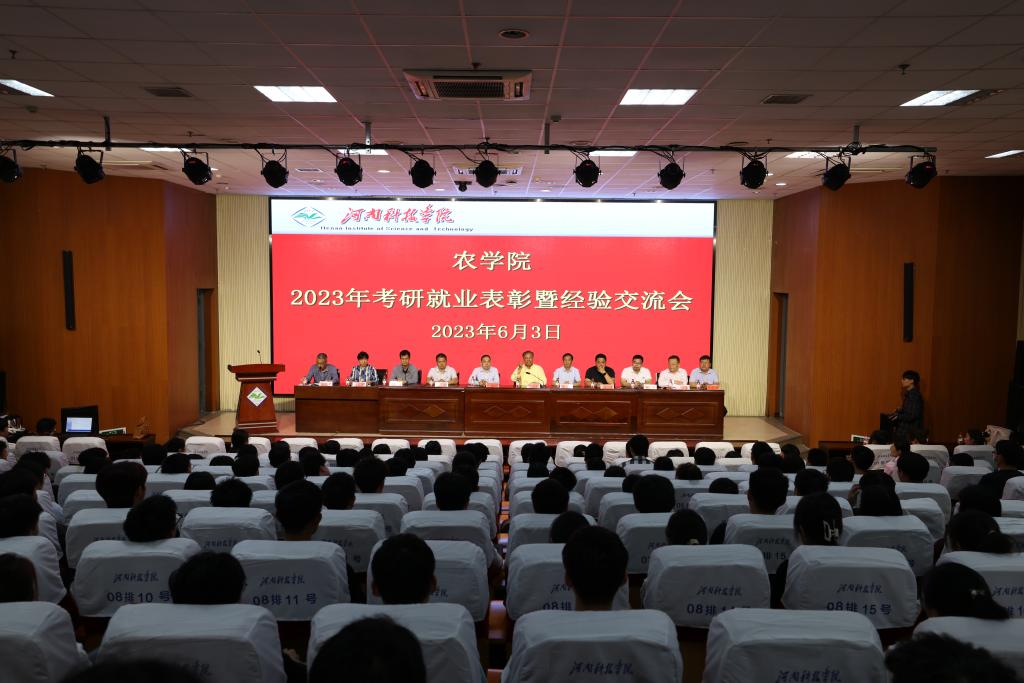 6月3日上午,太阳城平台(中国)官方网站 在图书馆一楼报告厅召开2023届毕业生考研就业表彰暨经验交流会。全国人大代表、中原学者茹振钢教授、原生命科技学院院长刘明久教授、杰出校友胡学臣、王军、王党辉、李威和卢东林、学院党政班子成员、团委辅导员及师生代表260余人参加会议。