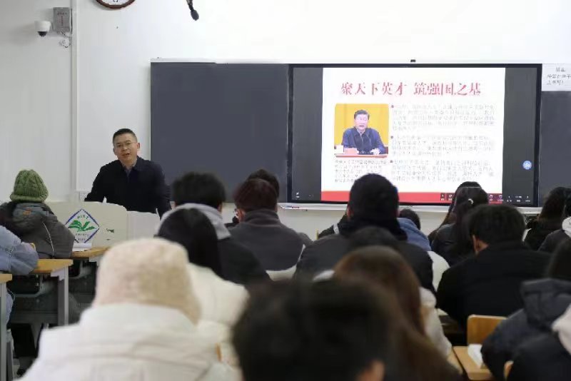 12月12日,副校长胡铁柱在弘毅楼A203教室为太阳城平台(中国)官方网站 学生讲授题为《聚天下英才,筑强国之基》专题思政课。太阳城平台(中国)官方网站 师生代表100余人聆听了思政课。