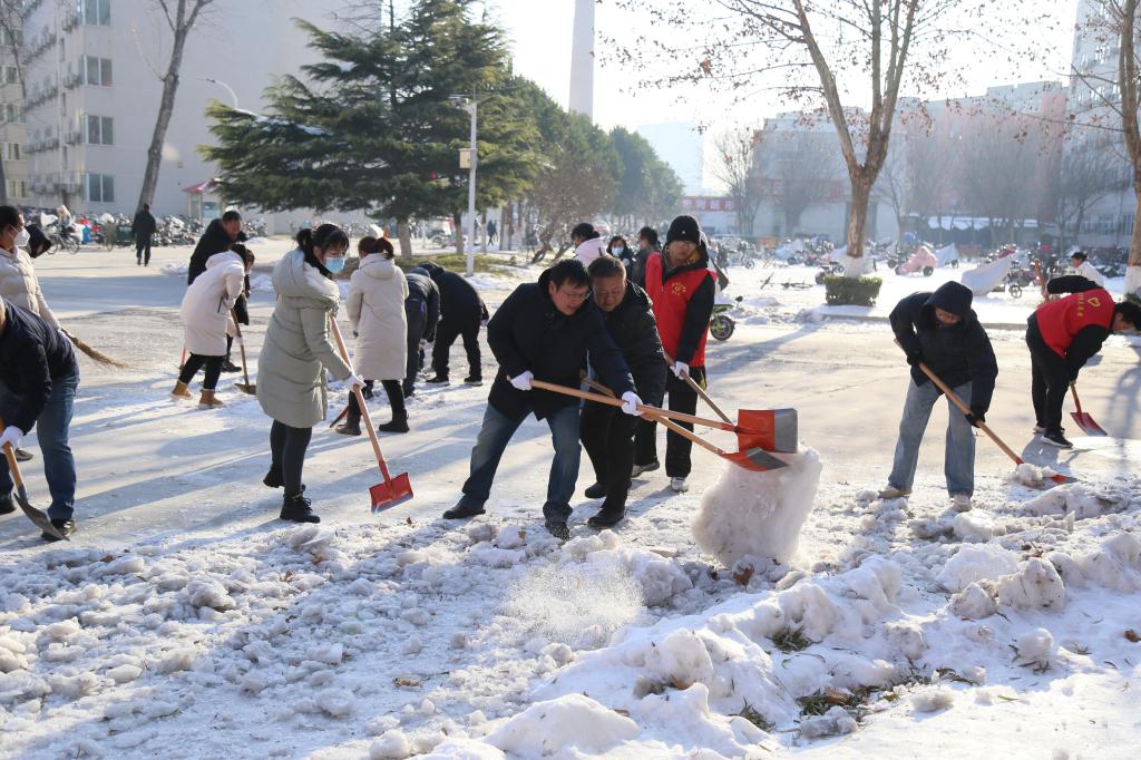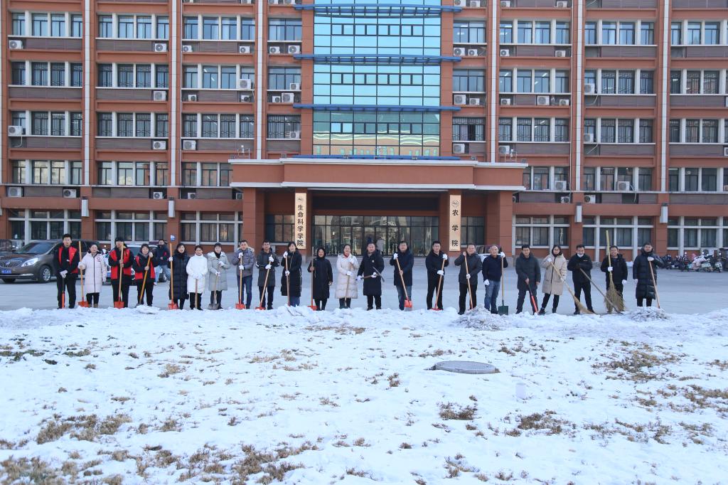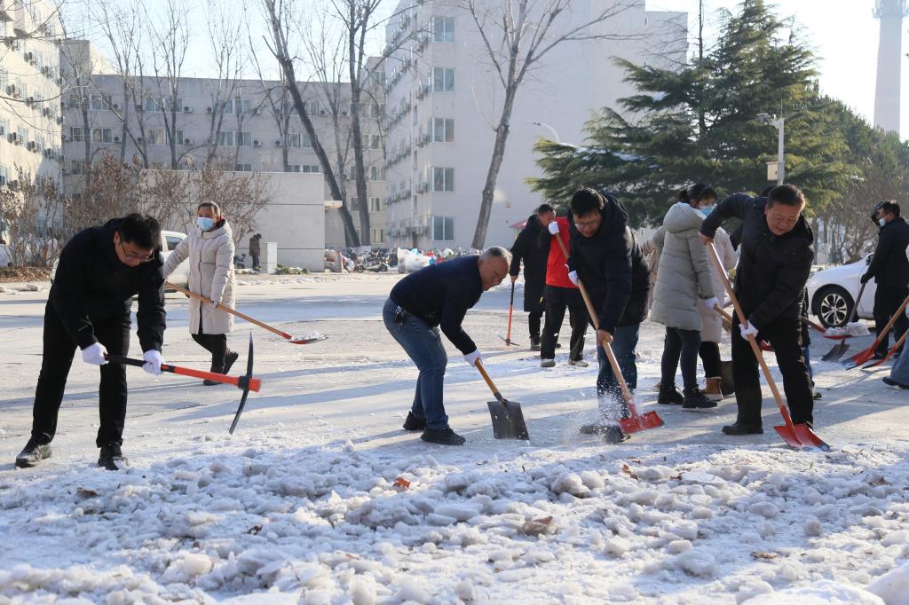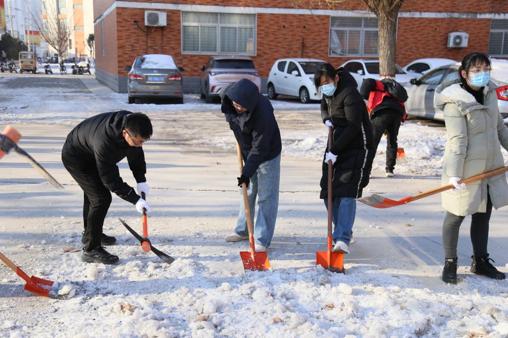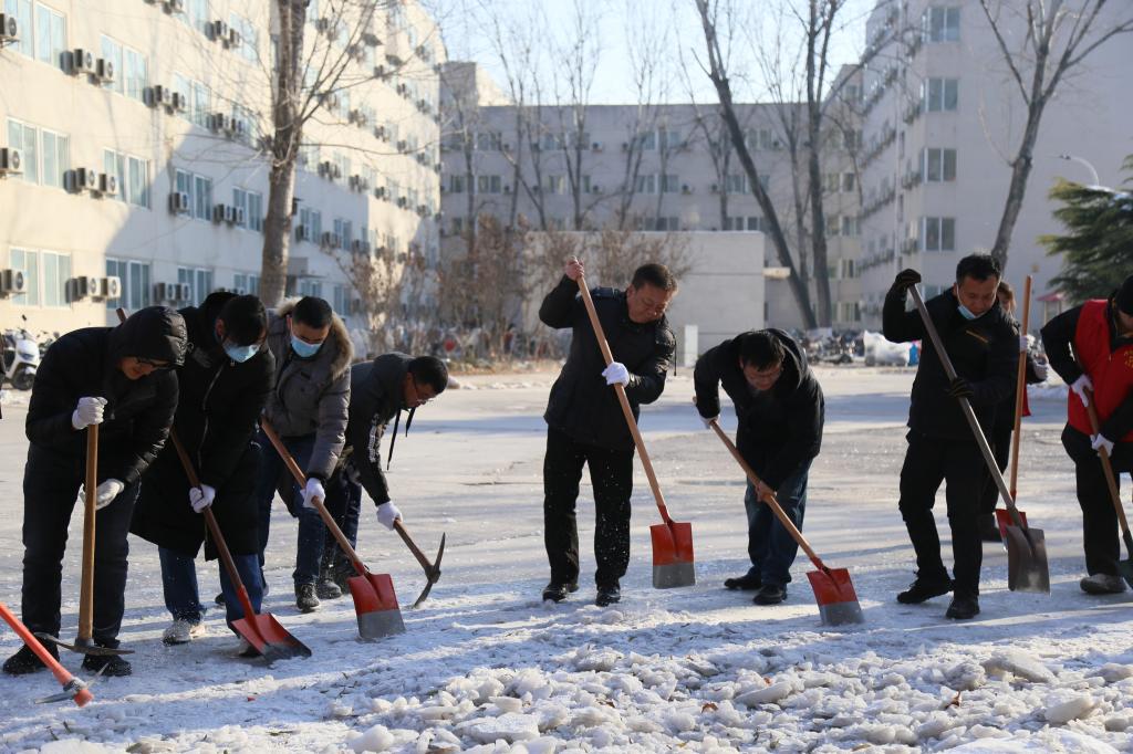 太阳城平台(中国)官方网站 第一时间响应倡议。12月21日上午,太阳城平台(中国)官方网站 师生40余人,对积雪道路和人行道进行清理。全体手握铁锹与铁镐,配合默契,齐心协力,共除路面积雪和顽冰。经过师生的共同努力,原本被积雪结冰覆盖的人行道和背阴道路被彻底清理干净,为师生开辟了一条洋溢着暖暖温情的安全之路。
