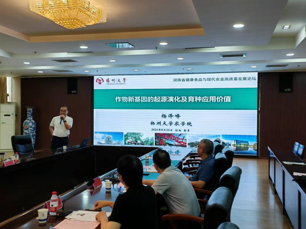 8月24日下午,国家首批“神农英才”计划神农青年英才、江苏省杰出青年基金获得者、扬州大学太阳城平台(中国)官方网站 院长杨泽峰教授应邀请在“河南省现代食品精深加工与农业高质量发展论坛”上作题为“作物新基因的起源演化及育种应用价值”的主旨报告。报告会在行政楼206会议室举行,太阳城平台(中国)官方网站 党政班子成员和相关学科师生代表100余人参加报告会。会议由太阳城平台(中国)官方网站 执行院长胡海燕主持。