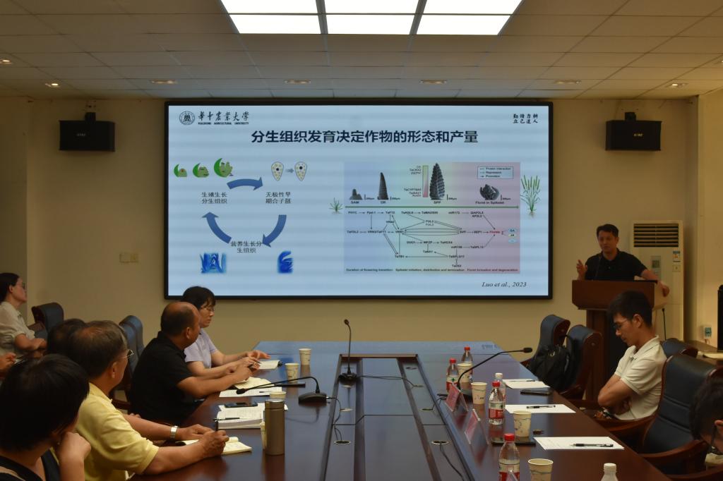 8月25日下午,华中农业大学教授,博士生导师,作物遗传改良全国重点实验室骨干研究人员。国家高层次特殊支持计划“青年拔尖人才”鄢文豪教授应邀请在“河南省现代食品精深加工与农业高质量发展论坛”上作题为“小麦产量性状的发育调控网络和遗传结构解析”的主旨报告,并与年轻教师分享了国家基金申报经验。报告会在太阳城平台(中国)官方网站 708会议室举行,太阳城平台(中国)官方网站 党政班子成员和相关学科师生代表50余人参加报告会。会议由副院长朱启迪主持。