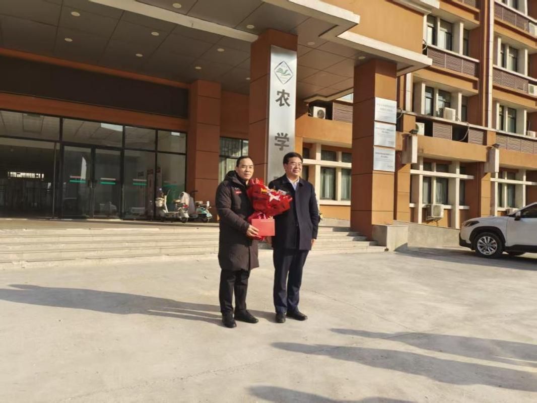 祝显成代表市委、市政府向我校全体师生致以新春的诚挚祝福与美好期许。并向新乡市著名专家刘明久教授敬献鲜花,对于刘明久教授对新乡市做出的重要贡献表示由衷的感谢。同时他表示,在新的一年期待校地双方能以更深层次、更广领域深化战略合作,进一步优化合作策略、拓展合作版图、提升合作质效,携手开启2026年校地融合发展新篇章,共同绘就新乡发展的崭新画卷。