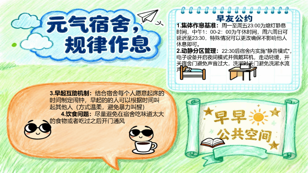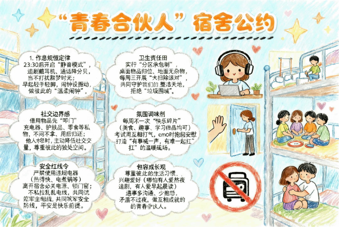 活动以 “共建共治共享”为核心理念,覆盖全院所有学生宿舍。各宿舍积极响应,结合自身生活特色与实际需求,围绕作息规范、内务整理、安全用电、学风建设、人际和谐、财物爱护等关键领域开展集体研讨。同学们集思广益、精心打磨,制定出一批内容详实、可行性强、独具创意的《宿舍公约》,充分展现了新时代农科学子的自主管理智慧与集体协作精神。